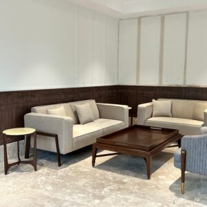 Contemporary Beige Sofa Set with Wooden Base & Coffee Table – Elegant Minimalism